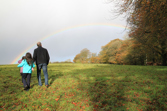 But of course where this is a rainbow there has been, recently, rain. And where there is a cow field, there has been, recently, a herd of cows. Together that makes for some very squelchy, squishy, mucky walking. We just can't get to the end of the rainbow, especially since that pesky end just keeps moving further and further into the field the closer we get.